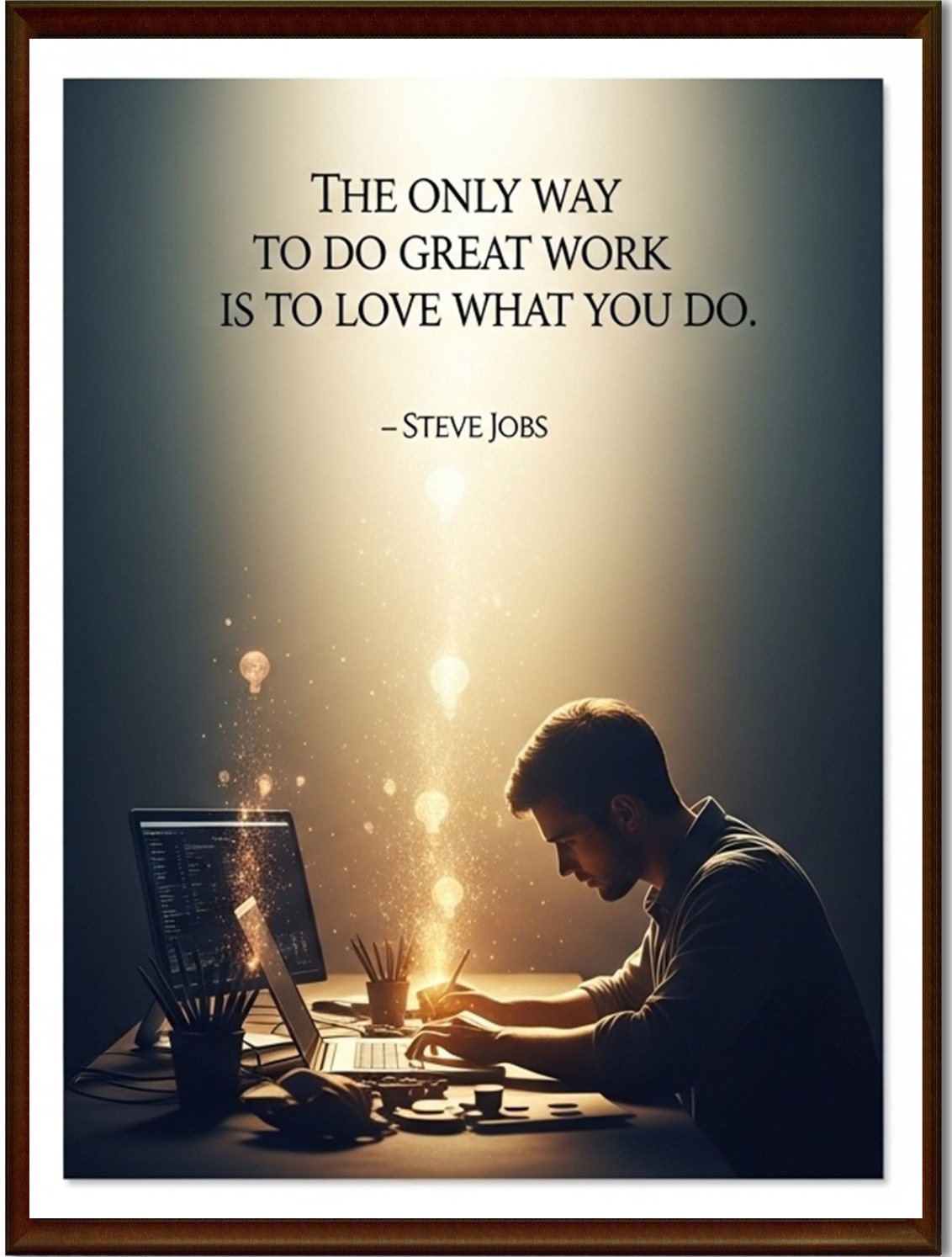 Elegant motivational wall frame featuring a powerful quote by Steve Jobs Inspires passion, creativity, and dedication toward work Modern artistic design with warm lighting and workspace theme Perfect for office desks, study rooms, and workspaces Ideal gift for professionals, students, and entrepreneurs High visual appeal that enhances focus and productivity